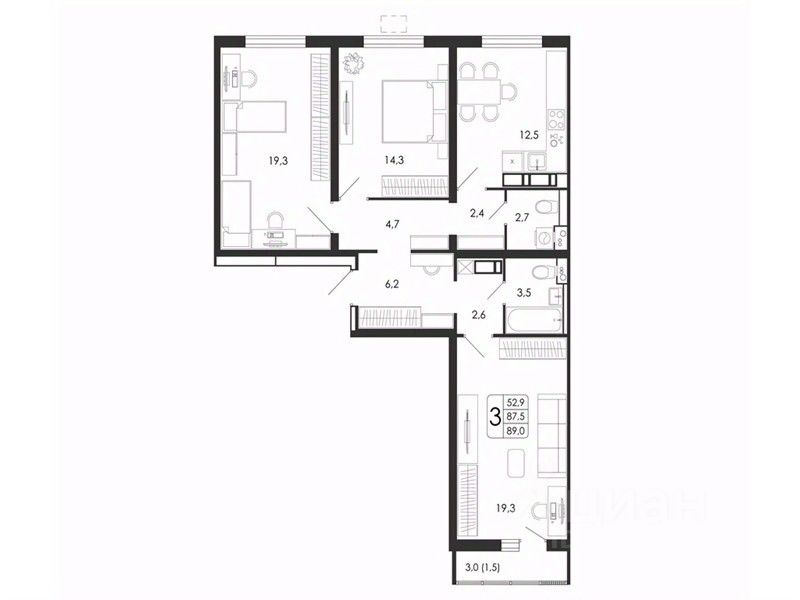 52,9 м²