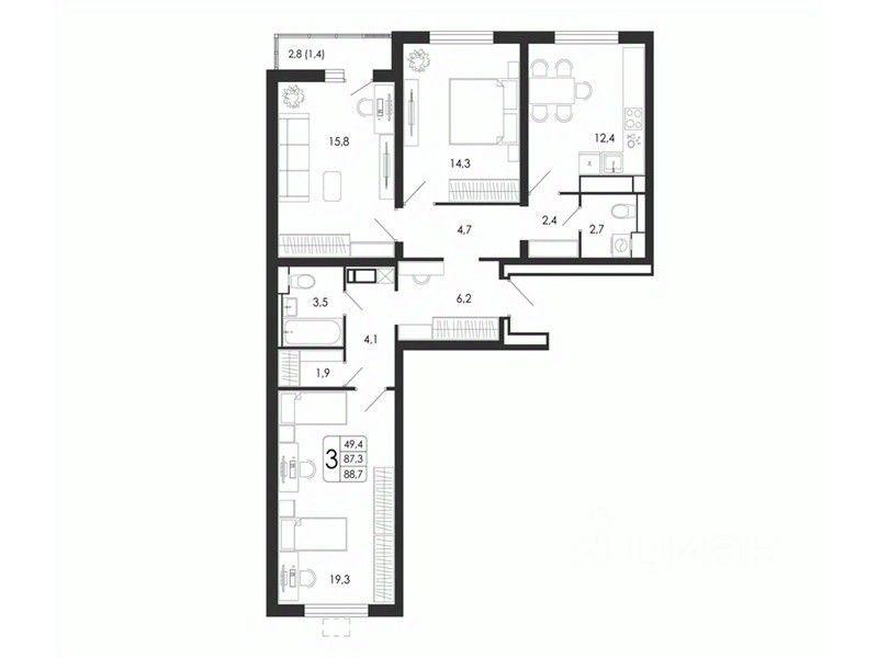 88,7 м²