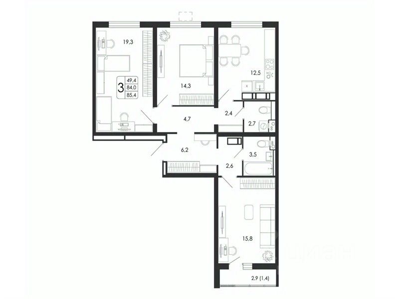 Квартира: 3 к 85,40 кв.м., 9 этаж в комплексе Яблоневые сады, 1 очередь, корп.15.2, сдача: 4кв. , этажей: 17, адрес Воронеж г., Загоровского ул., , Застройщик: ВЫБОР.