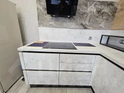 Остаётся современная кухня, отличное состояние, дорогой МДФ, дорогая фурнитура. Есть система очистки воды. Остаётся вытяжка, варочная панель. Диван, красивый молочный цвет, очень удобный, кондиционер, посудомоечная машина.