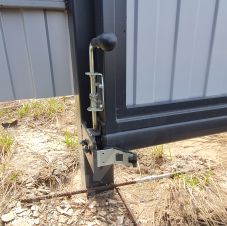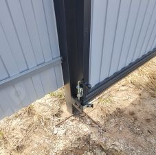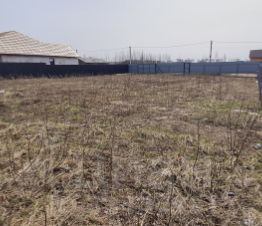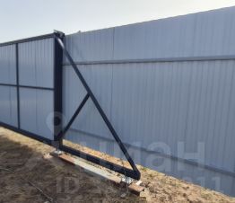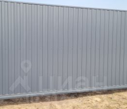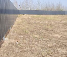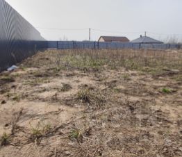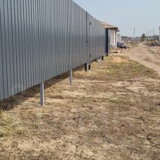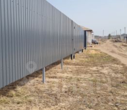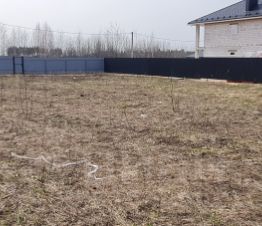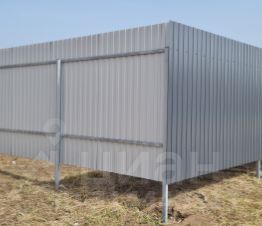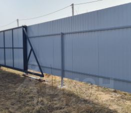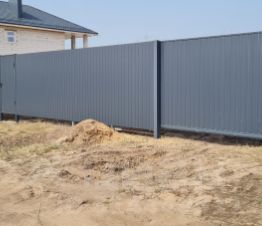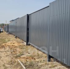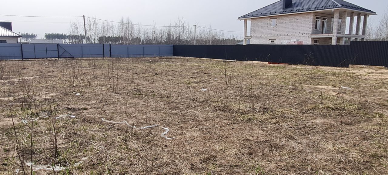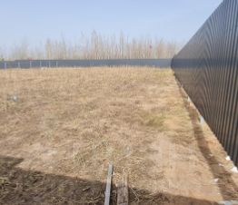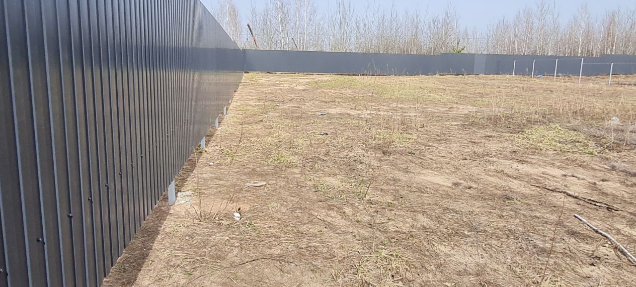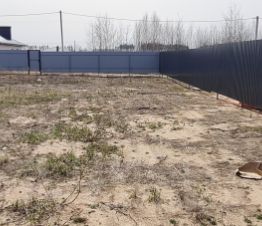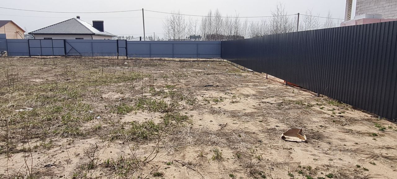 Участок ровный, очищен от деревьев, с трех сторон огорожен забором, а со стороны соседнего дома установлены железные опоры для крепления любого материала.