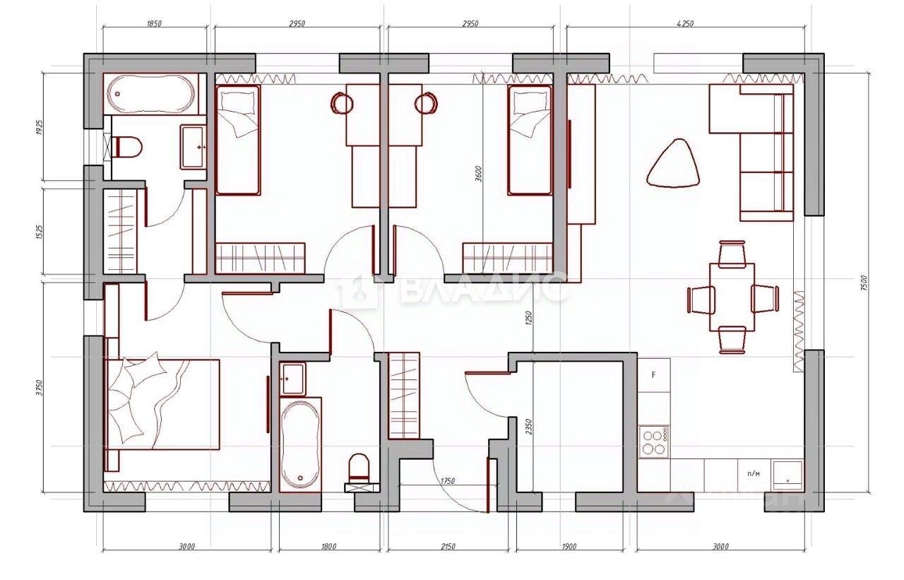Просторная кухня-гостиная, три отдельные комнаты, два с/у, большая прихожая и помещение для гардеробной.