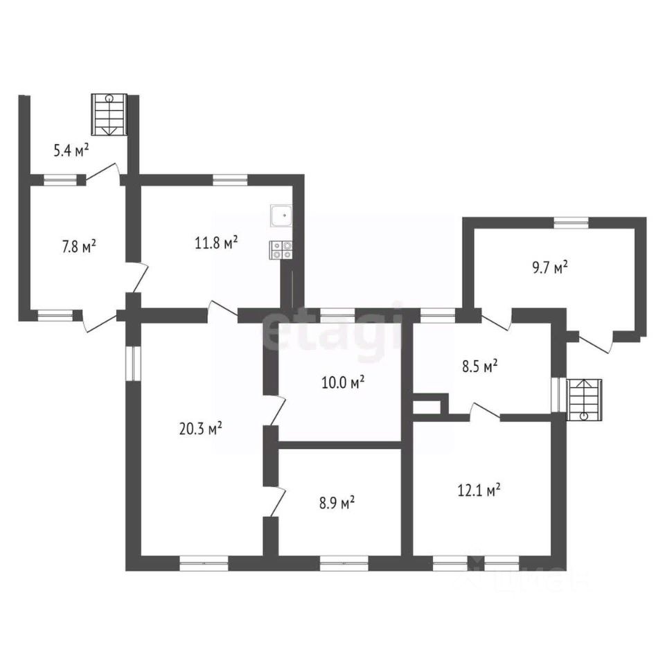 Помещения, м. кв. : 8,9 спальня; 10 спальня; 20,3 зал; 11,8 кухня; 7,8 коридор и раздельные - ванная и санузел; 5,4 прихожая в огород; 8,3 прихожая в дом ; хоз. помещение первое 6,6; 9,6 - второе.