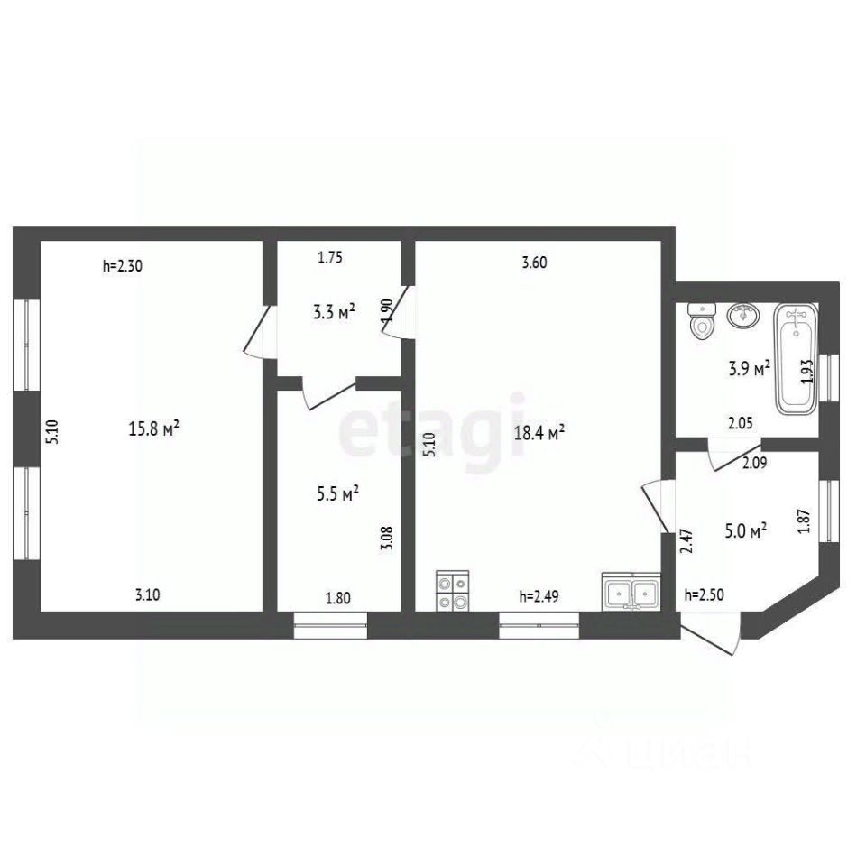 - 2 жилых комнаты + просторная кухня-гостиная 18 кв.м