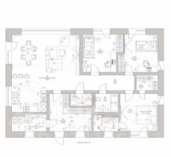 - Площадь:164 м², потолки 3,5 м, панорамные окна 2,4 м.