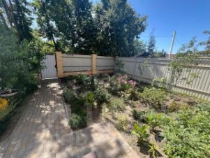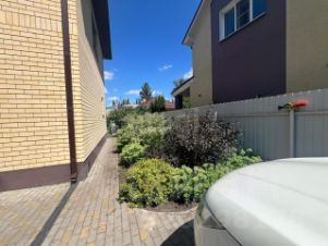 Территория двора полностью благоустроена. Передний двор выложен тротуарной плиткой, обустроены дорожки, парковочное место, клумбы, места для кустарников и плодовых деревьев (персики, сливы). На заднем дворе газон и огород. Есть место для установки бассейна и беседки. За границей участка (задний двор), имеется участок земли, около 0,7 сотки, со статусом "Особо охраняемая территория", который официально можно