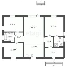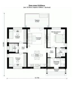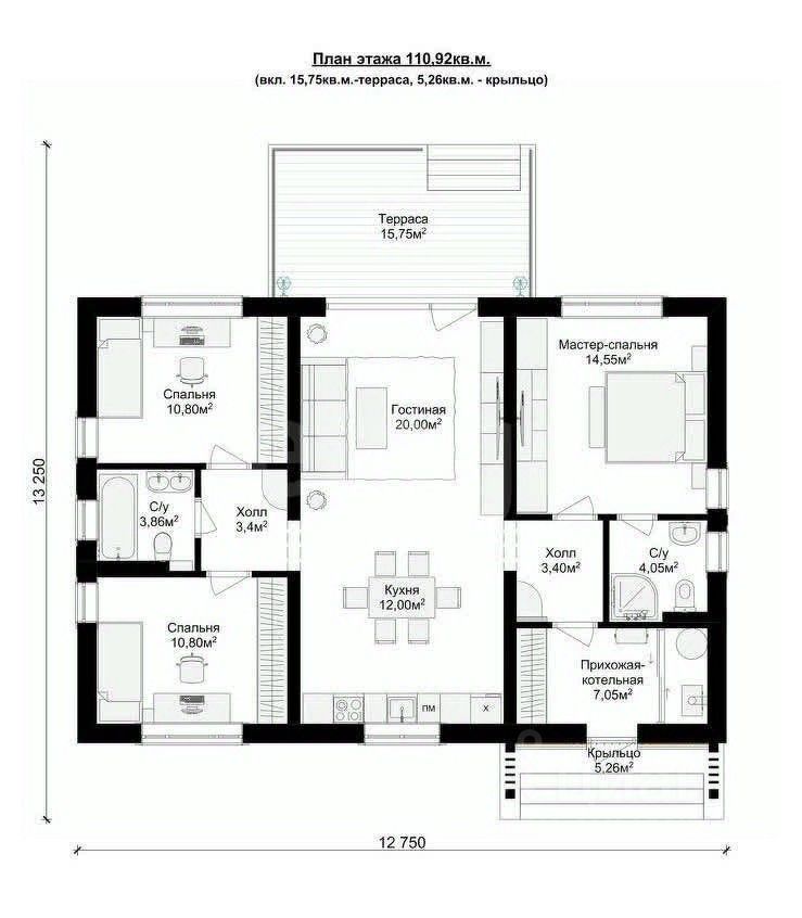 Планировка дома продумана для комфортной жизни: три изолированные спальни, просторная кухня-гостиная с прямым выходом на собственную террасу и два санузла.