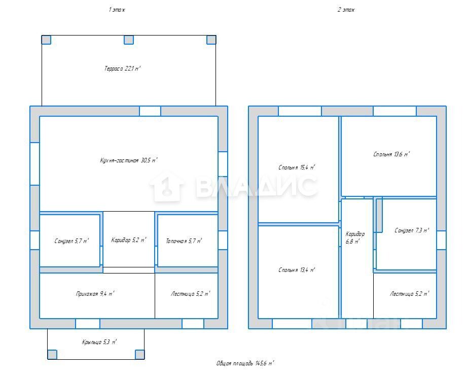 - Просторная площадь: общая площадь дома составляет 145,6 кв. м, что позволяет комфортно разместить всю семью. Жилая площадь — 42,4 кв. м, площадь кухни — 30,5 кв. м.
