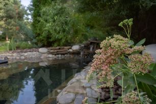 На участке площадью 12 соток организован ландшафтный дизайн с системой авто-полива, грамотное зонирование отлично сочетает: декоративный пруд с водопадом, зону отдыха, зону барбекю, детскую игровую площадку с уютным домиком, батутом и песочницей.