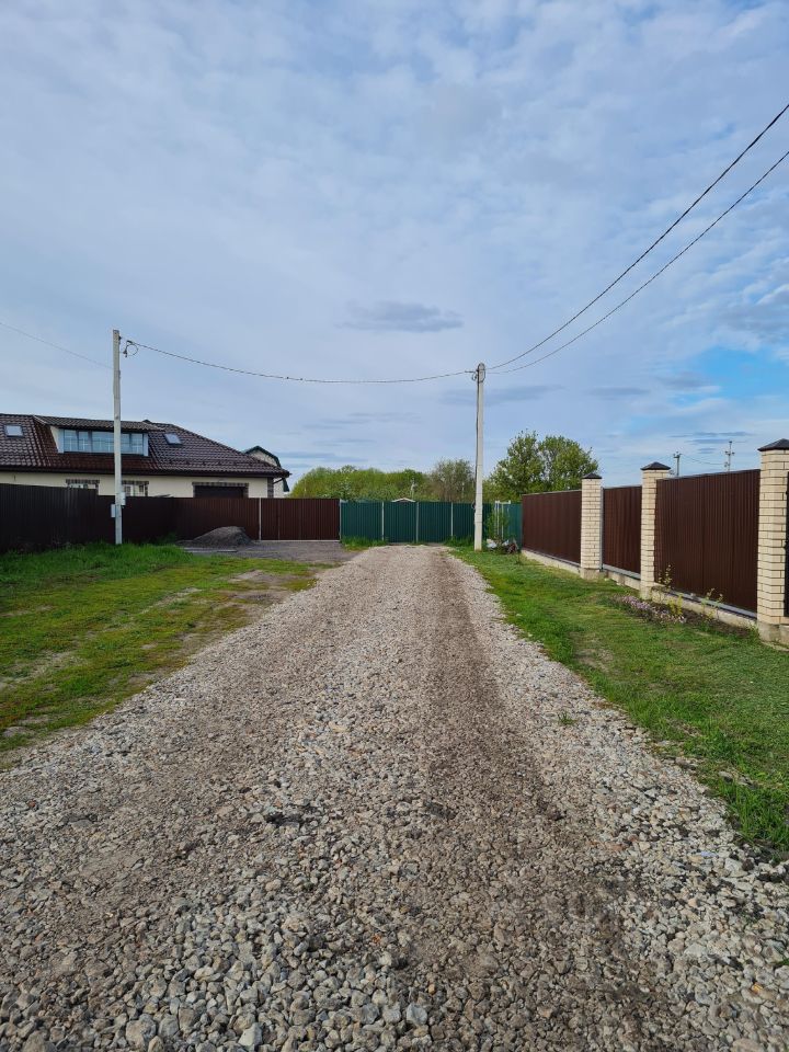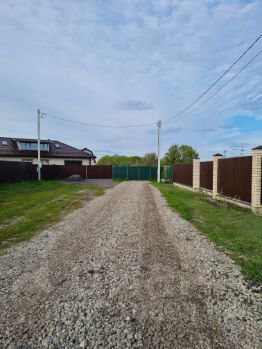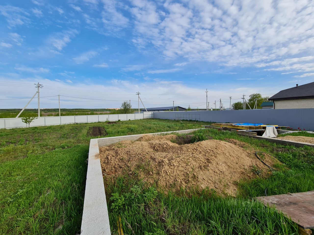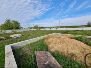 На участке имеется фундамент под дом, молодой сад и забор из металлопрофиля. Электричество и вода подключены (скважина на территории посёлка) Газ ведётся по посёлку, соседи уже подключили. Имеется железный гараж 3*6 метров.