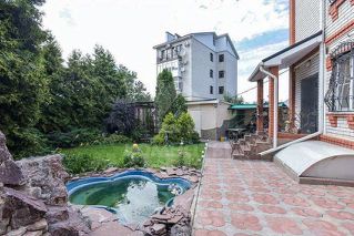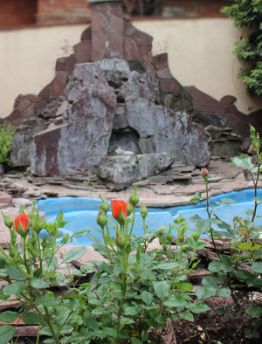 Благоустроенная территория двора - водопад из яшмы с прудом и подсветкой, взрослые туи представляют живую изгородь по периметру участка, установлен автоматический полив лужайки в заданное время, ухоженный розарий с капельным поливом, в зоне отдыха под навесом установлен кованный мангал, имеется чугунный казан ручной работы. Кованные элементы декора по кирпичному забору.