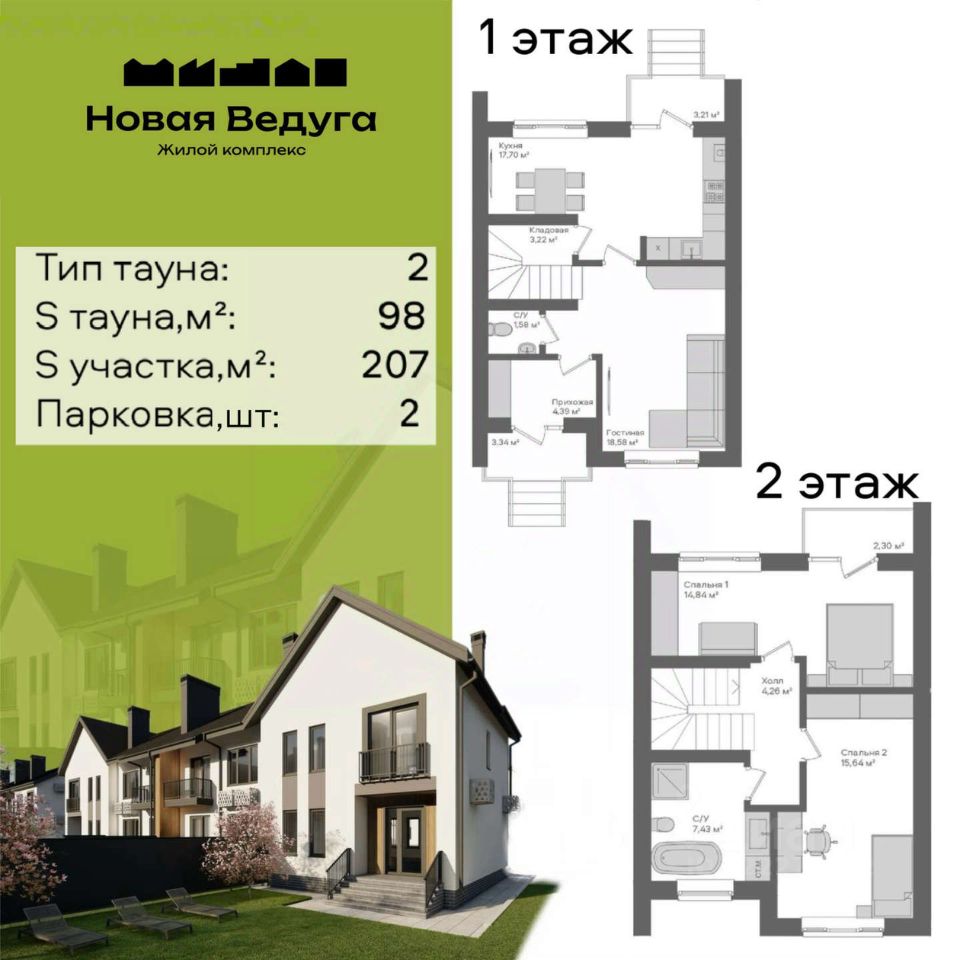 Таунхаус 98 кв.м с земельным участком 207 кв.м в ЖК "Новая Ведуга" уют и комфорт рядом с городом. Особенности ЖК "Новая Ведуга": закрытая охраняемая территория; пруд с пляжем, прогулочные зоны, пикник-парк; магазины, аптека, кафе в шаговой доступности; детский сад на территории, школа в 8 минутах; парковочные места, спортплощадки, чистая экология. Удобное расположение всего 9 км от Воронежа, 30 минут до центра. Купить таунхаус от застройщика выгодно и надёжно. БЕСПЛАТНОЕ ОДОБРЕНИЕ ИПОТЕКИ И СОПРОВОЖДЕНИЕ СДЕЛКИ! ДИЗАЙН-ПРОЕКТ В ПОДАРОК! • Семейная ипотека от 4.6% на весь срок! • Семейная ипотека для семей с двумя детьми до 18 лет! • Рассрочка с первоначальным взносом 20% до окончания строительства ( 3 кв 2026) • Первоначальный от 10% • Трейд-ин "Меняй старое на новое"