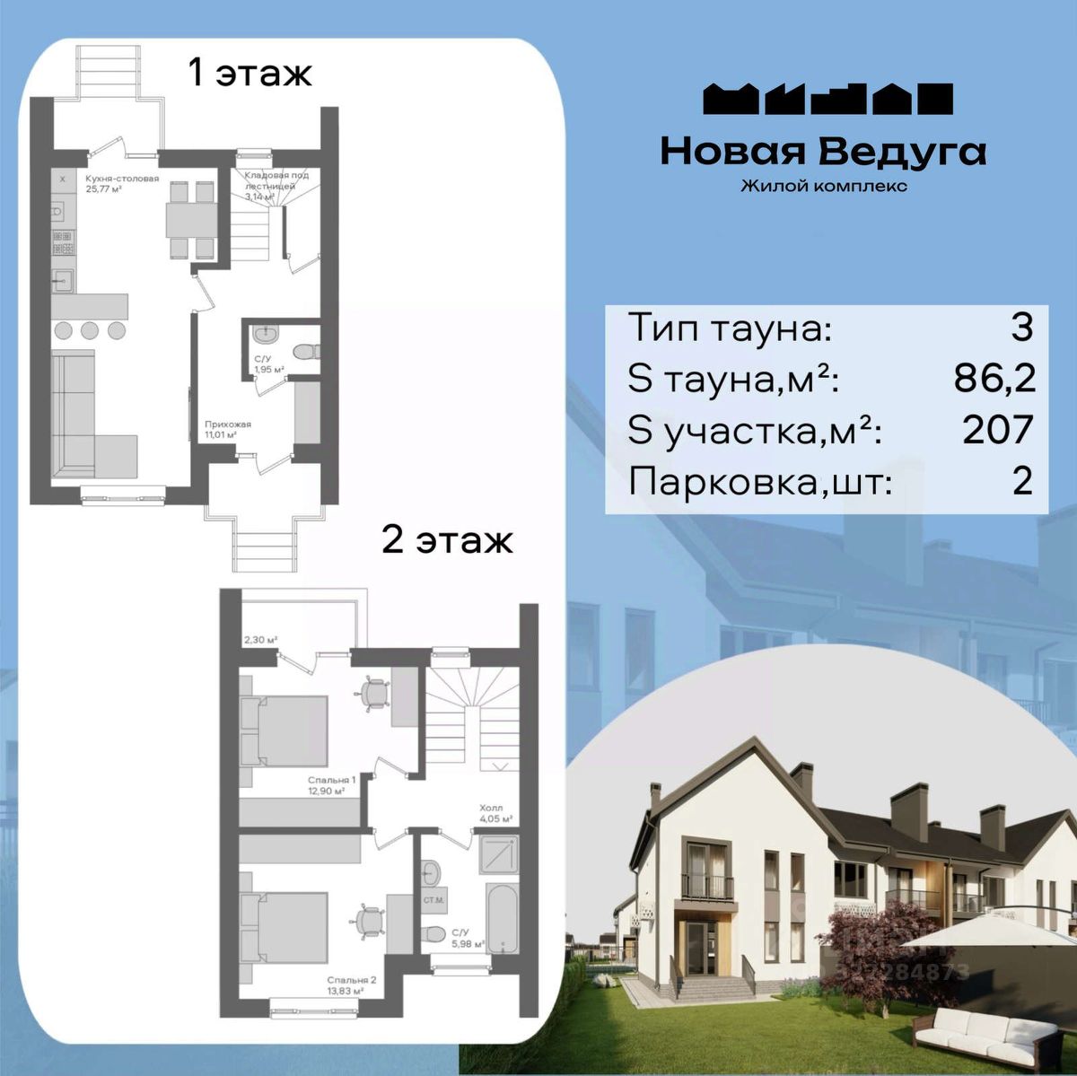 Уютный таунхаус 86,2 кв.м с земельным участком 207 кв.м в ЖК "Новая Ведуга" комфорт по доступной цене