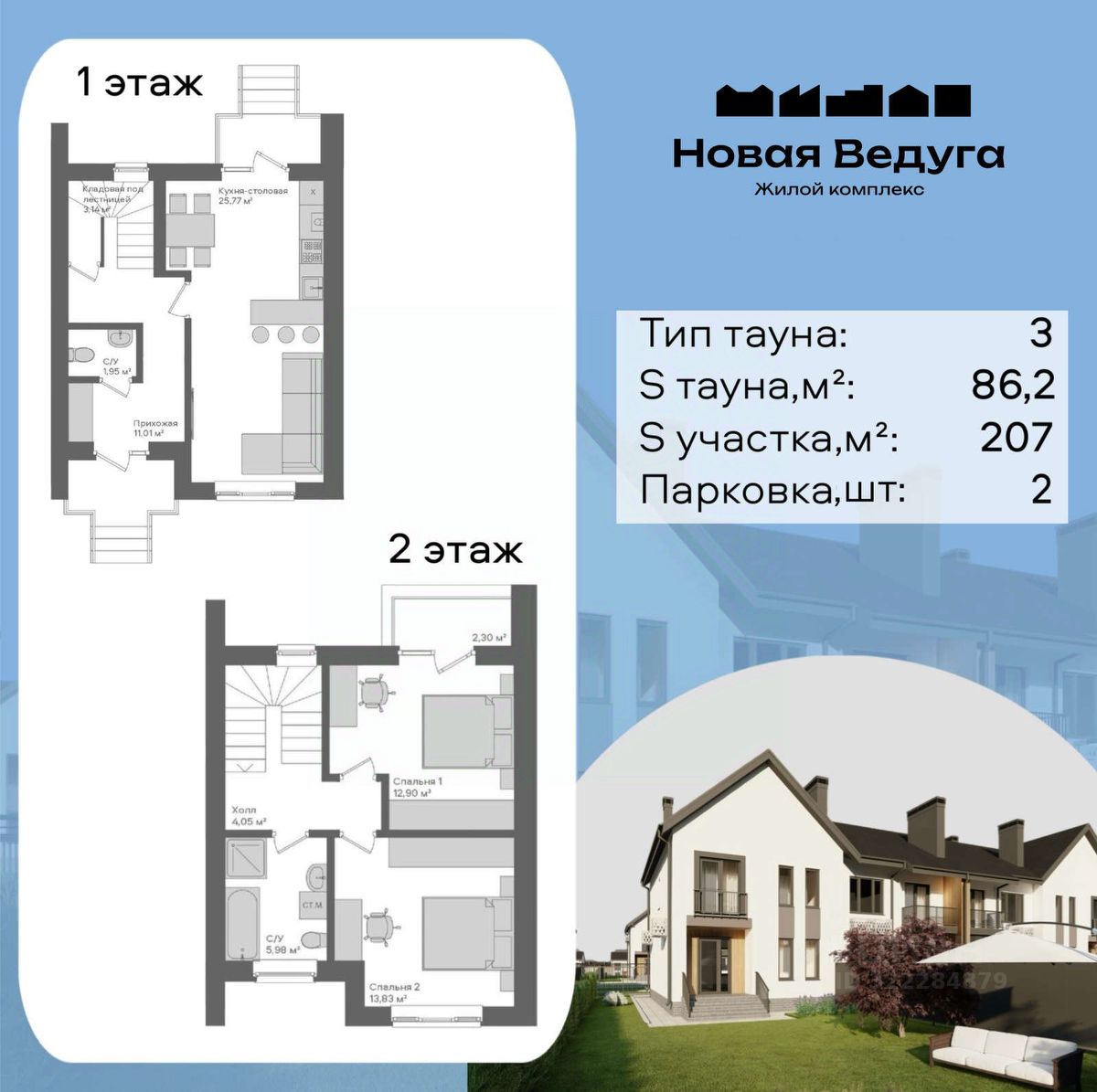 Уютный таунхаус 86,2 кв.м с земельным участком 207 кв.м в ЖК "Новая Ведуга" комфорт по доступной цене