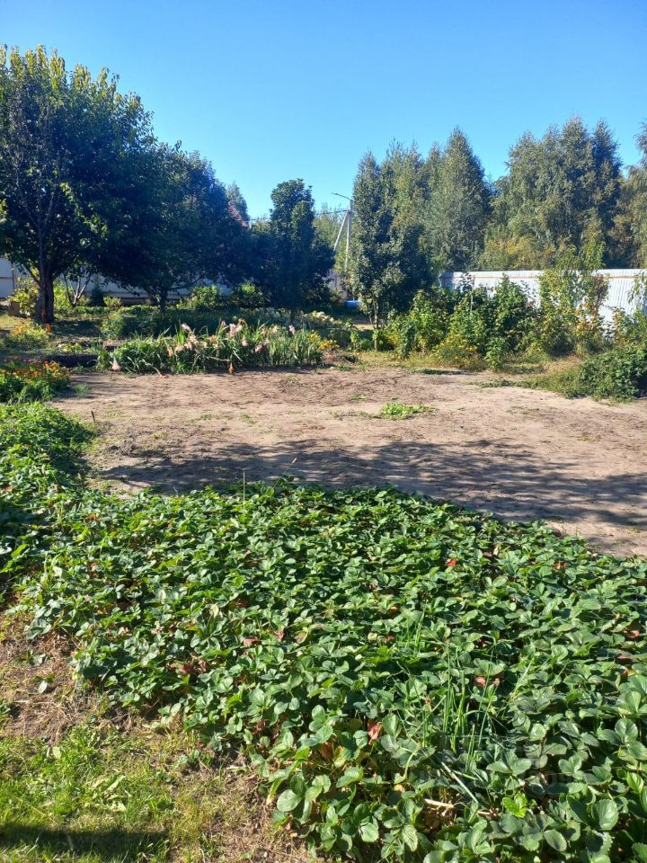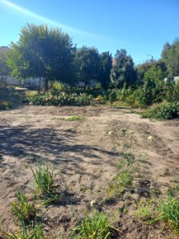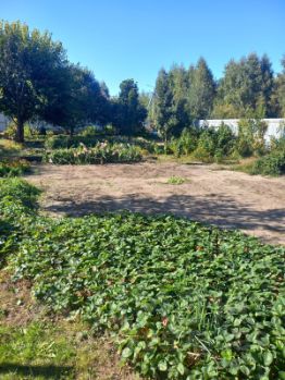Ровный участок, который использовался под огород- высажены растения- яблони, вишня, смородина, ежевика, малина, голубика, жимолость, клубника.
