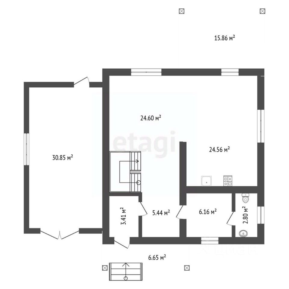 1-й этаж: холл - 5,44 м2, кухня столовая - 24,56 с выходом на террасу - 15,86 м2, на задний двор, гостиная 24,6 м2, котельная (хоз помещение) , сан узел - 2,8 м2, крыльцо - 6,65 м2, терасса 15,86.