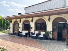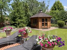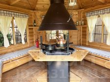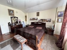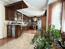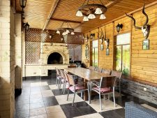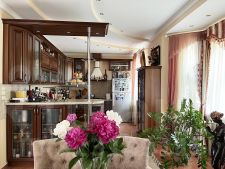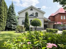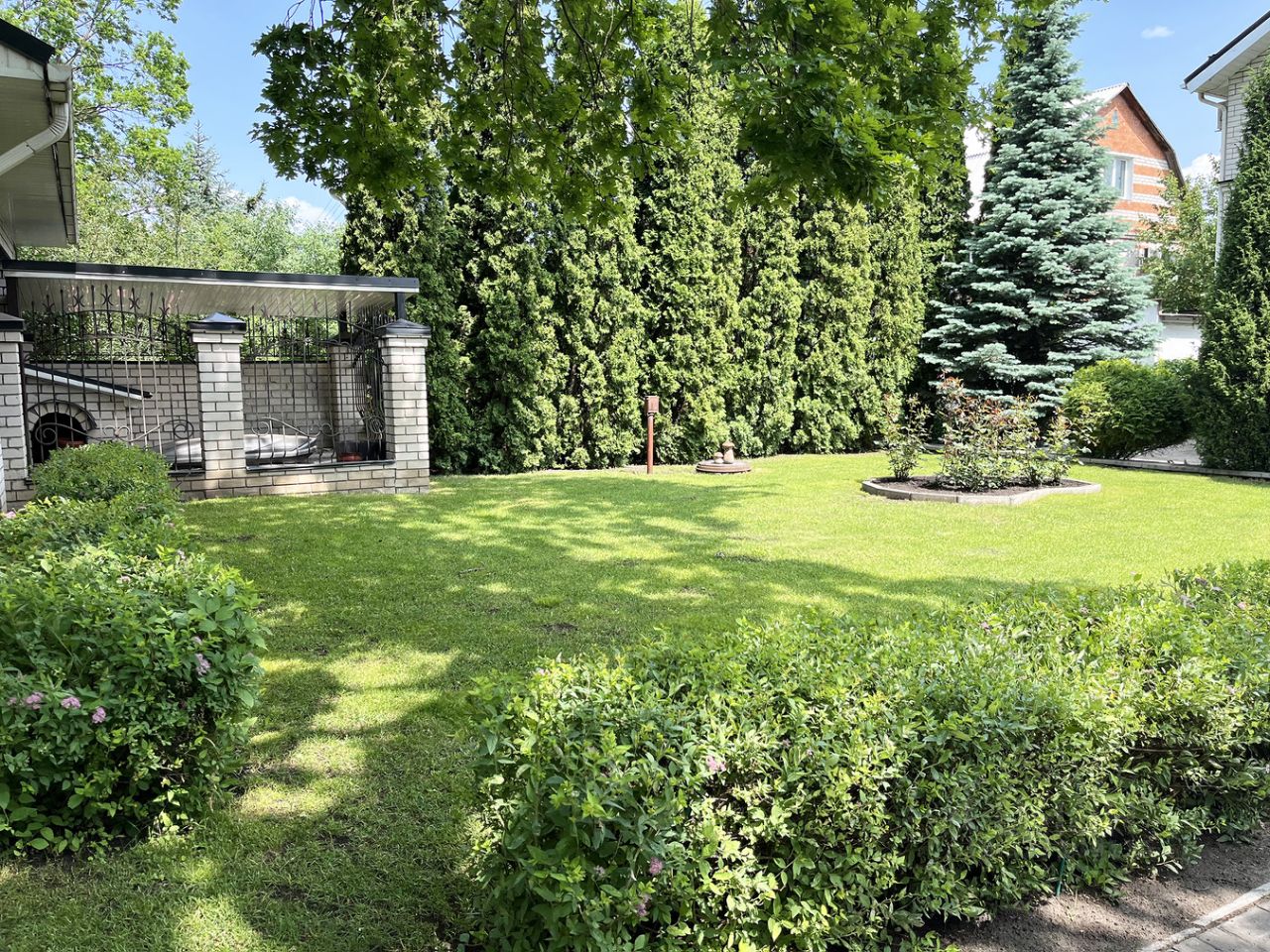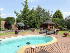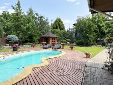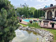 Участок — 13 соток, благоустроен с душой: газон, деревья, пруд с рыбками, бассейн, беседка с летней кухней и каменным мангалом, зона отдыха с грилем.