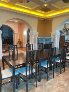 на первом этаже расположены просторный холл (33 кв. м), кухня (23 кв. м) и гостиная (30 кв. м) с зеркальным потолком, рассчитанная на размещение большой обеденной группы и углового дивана.
