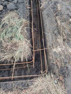 Фундамент ленточный, монолитный (бетон 300) 1,1 м. Армопояс 4 кирпича.