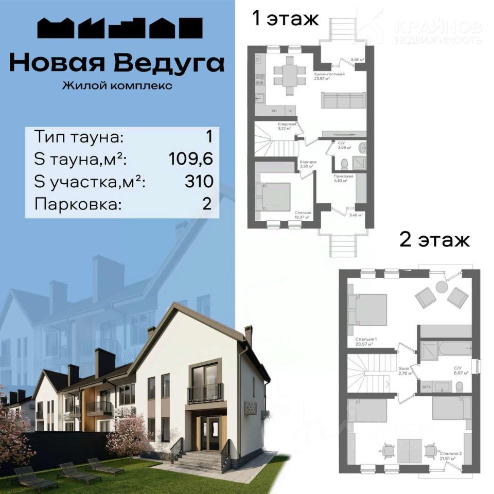 ПРОДАЖА ТАУНХАУСА В КП НОВАЯ ВЕДУГА !!! ДВА ЭТАЖА, ЗЕМЕЛЬНЫЙ УЧАСТОК, СОБСТВЕННЫЕ ПАРКОВОЧНЫЕ МЕСТА !!!СЕЛЬСКАЯ ИПОТЕКА !!! СЕМЕЙНАЯ ИПОТЕКА !!! ТРЕЙД-ИН !!!Продаётся таунхаус в Яблоневом квартале, с. Гудовка , КП НОВАЯ ВЕДУГАКоттеджный поселок проектируется по системе "умный поселок".Это 5 очередей строительства в едином авторском архитектурном стиле и в общей концепции городского комфорта загородного жилья.Жилой комплекс создается по европейским принципам квартальной застройки. Формат 2-этажных таунхаусов совмещает удобство благоустроенной территории с индивидуальностью частного дома.У каждого блока свой огороженный двор и место для парковки с удобным въездом.Территория закрыта от посторонних и круглосуточно охраняется, въезд через КПП .Чистоту и порядок в комплексе гарантирует собственная управляющая компания.Стандарты загородной жизни расширяются за счет продуманных коммуникаций: централизованное водоснабжение и канализация, индивидуальные газовые приборы и встроенно-пристроенные котельные, умное отопление дома в зависимости от температуры окружающей среды.Зарядные станции для электромобилей в каждом квартале.Коттеджный поселок находится всего в 9 км от Воронежа. Для комфорта жителей до ЖК легко добраться не только на машине, но и на общественном транспорте, ведь до умной остановки всего 10 метров. В 8 км от жилого комплекса расположен горнолыжный комплекс Донгор.Мультиформатность