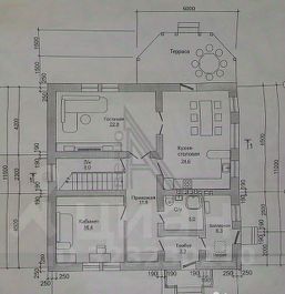 На первом этаже дома расположена кухня-столовая - 25 м.кв. объединенная с гостинной - 23 м.кв., сан узел, бойлерная и гостевая комната