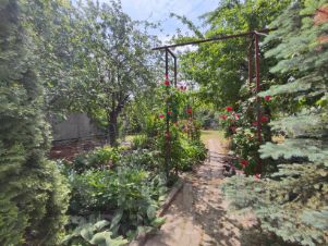 Ухоженная придомовая территория: есть место для парковки автомобиля, дорожки выложены тротуарной плиткой, на участке взрослые плодовые деревья-яблони, груши и кусты роз, жасмина. Также есть зона барбекю и крытая беседка, позволяющая приятно провести время с друзьями и семьей на свежем воздухе.