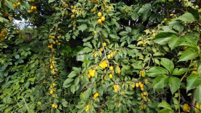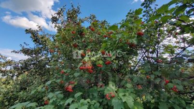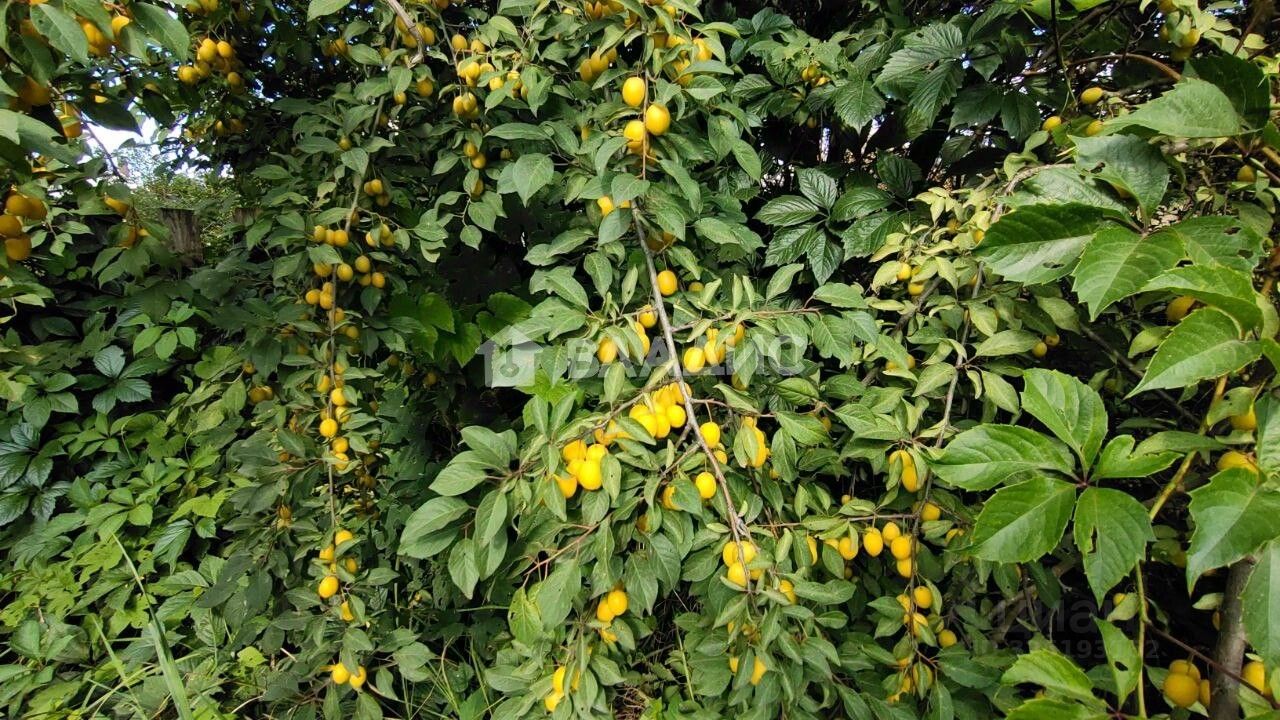 На участке растут плодовые деревья: абрикос, алыча, крупный тёрн, барбарис и шиповник, которые уже начали приносить плоды.