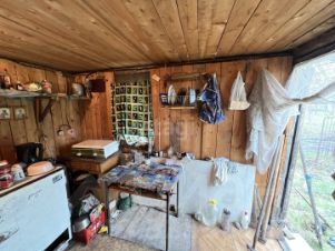 Участок огорожен сеткой рабицей, на участке стоит капитальная постройка- деревянный дом, обшит высокопрочным железом.Есть туалет и душ.