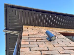 Мягкая кровля, красивый облицовочный кирпич, цоколь также закрыт облицовочным кирпичом, а низ цоколя обработан влагоотталкивающим покрытием, предусмотрены выводы воды на участок и с входной группы и со двора, красивое освещение, а также предусмотрено освещение участка с террасы.