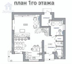 1 этаж: просторная кухня-гостиная с зонированием, кабинет, санузел, гардеробная, кладовая и котельная с отдельным выходом на улицу.