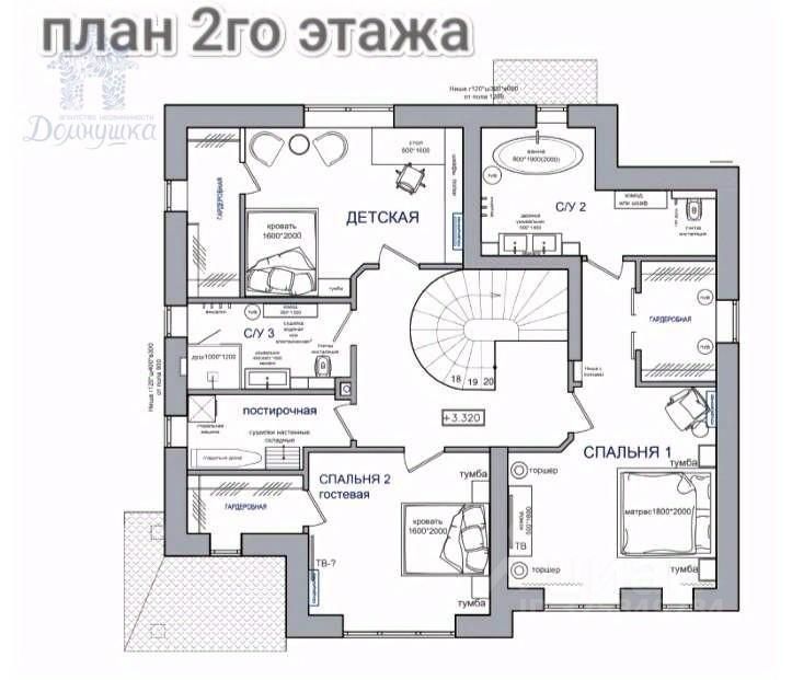 2 этаж: наверх ведет монолитная винтовая лестница. Здесь расположены 3 спальни: мастер-спальня (со своим санузлом и гардеробной), детская и гостевая спальни (каждая со своей гардеробной), постирочная и общий санузел.