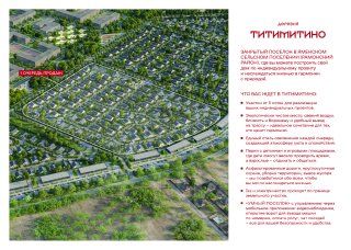 Предлагаем к приобретению перспективный земельных актив "Деревня Титимитино". К покупке предлагаются три очереди проекта, каждая из которых может быть реализована как единственный инвестиционный лот.