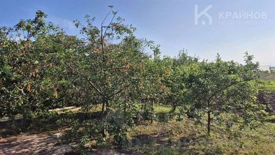 Сад с молодыми деревьями (яблони, груша, черешня, вишня), малина, клубника, ежевика.