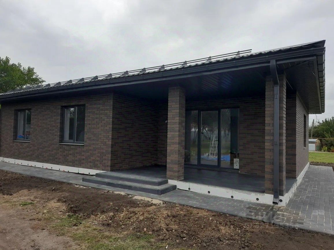 Дом площадью 96 кв м + 15 кв м терраса под общей кровлей на фундаменте- выход из кухни-гостиной.