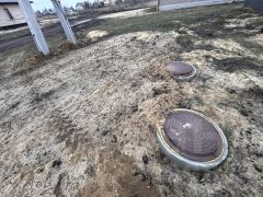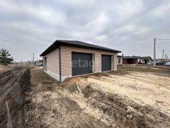 Гараж : 75 м2, на три автомобиля, автоматические ворота (3 шт.), теплый пол, материал стен: газосиликат 300 мм + кирпич 120 мм., кровля битумная черепица, утеплитель 200 мм, залит бетонный армопояс.