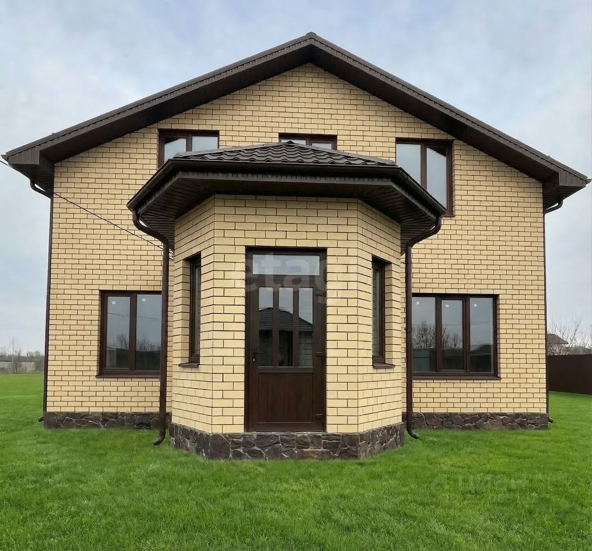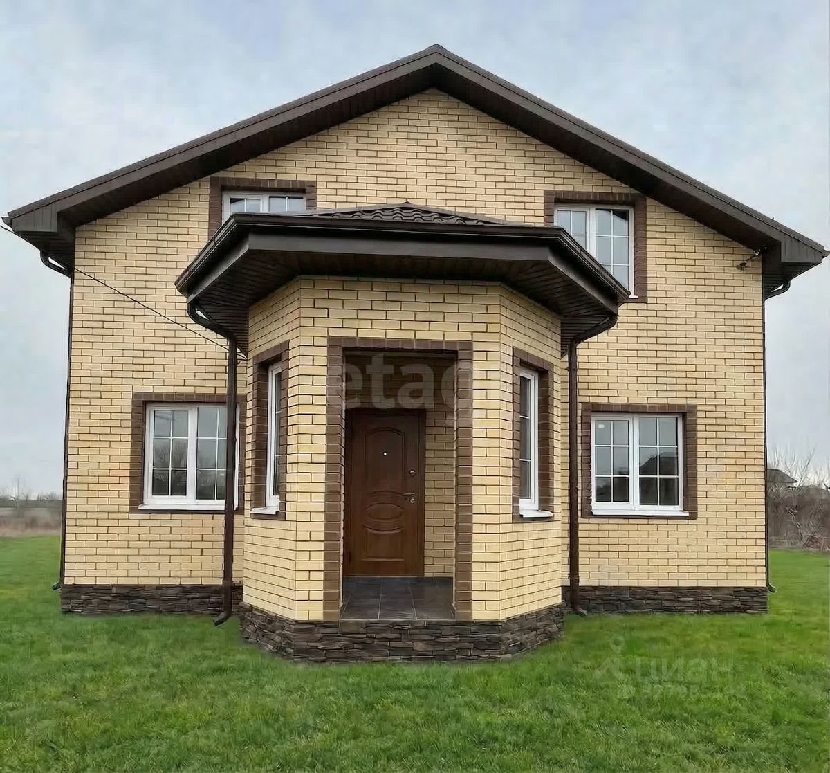 К участку уже подведены магистральный газ, электричество, вырыт колодец, что существенно сокращает сроки и затраты на ввод в эксплуатацию. Проектом предусмотрено два этажа: на первом уровне размещаются кухня, гостиная, комната и санузел, на втором — три комнаты и санузел. Один из вариантов фасадной отделки представлен на фото.