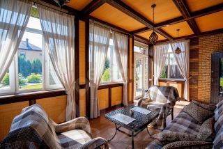 Фасад коттеджа выполнен из рустированного кирпича, природного и отделочного камня.