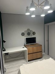 3 отдельные комнаты (спальня, детская и рабочий кабинет) + лоджия.