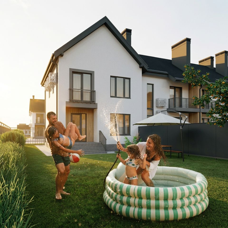 — Таунхаус 96,1 м² с собственным земельным участком 310 м² — Удобная планировка для семьи — Своя парковка и двор — тепло зимой, прохладно летом