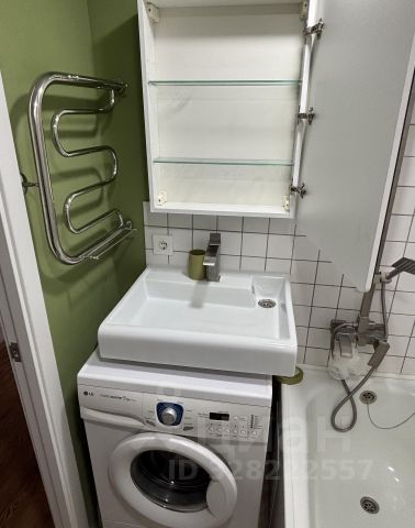 Большой совмещенный санузел, оснащён ванной, сушилкой для белья, раковиной, унитазом и современной стиральной машиной.