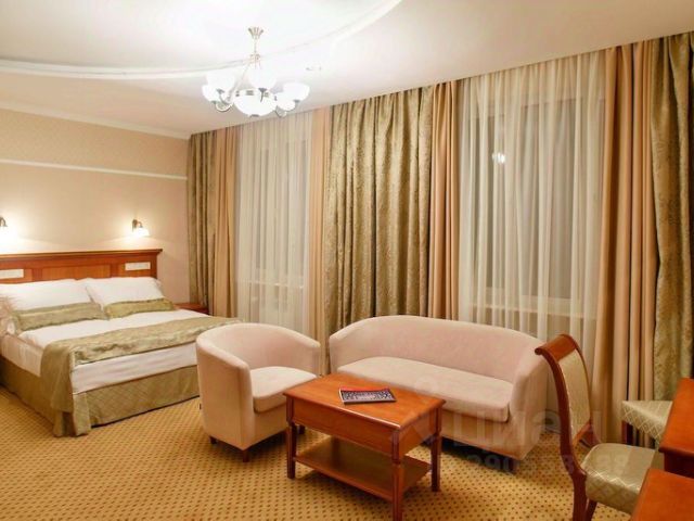 В гостиной-спальне: двуспальная кровать, шкаф, зеркало, прикроватная тумба, журнальный столик, телевизор с плоским экраном, холодильник, сплит-система, ковровое покрытие.