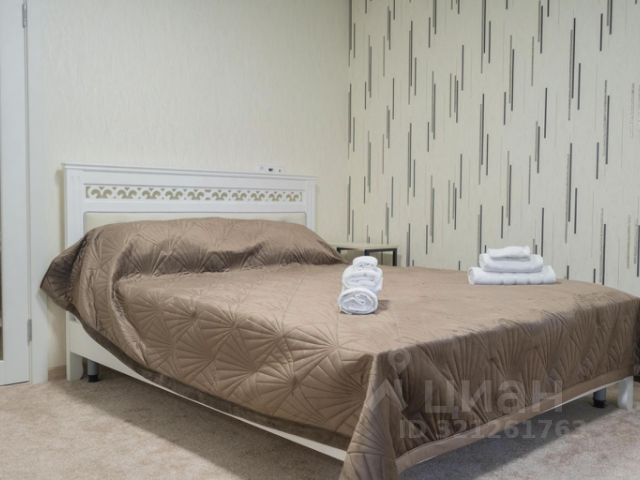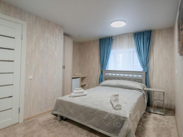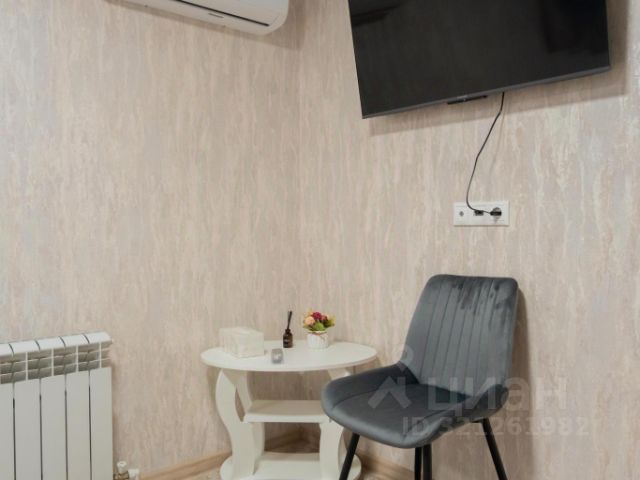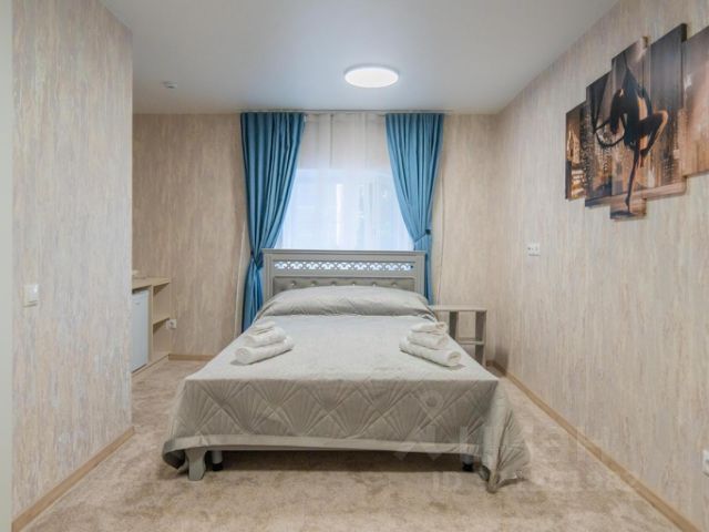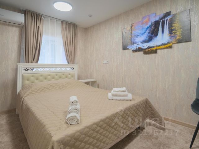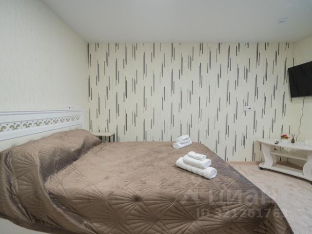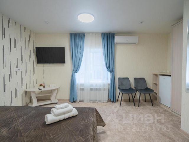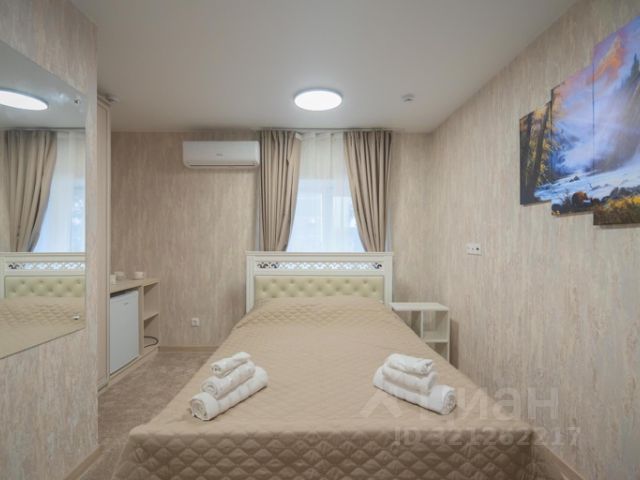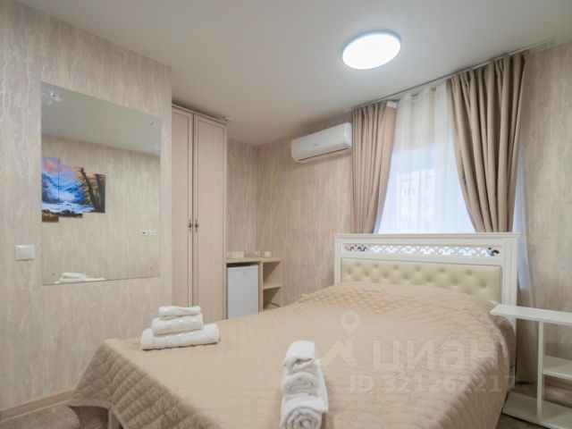 В гостиной-спальне: двуспальная кровать, шкаф, зеркало, прикроватная тумба, журнальный столик, телевизор с плоским экраном, холодильник, сплит-система, ковровое покрытие.