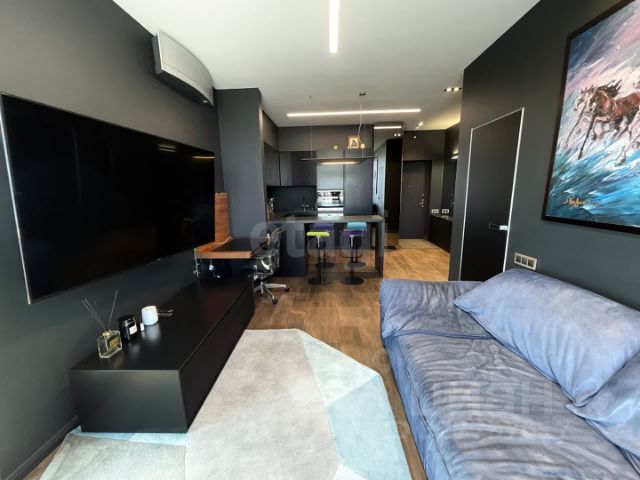 Также имеется отдельная кухня совмещенная с гостиной, полностью оборудованная всей необходимой бытовой техникой и мебелью: индукционная встроенная плита Ligron Tech, вытяжка Miele, духовой шкаф с функцией СВЧ Miele, встроенный холодильник Miele, встроенная стиральная машина Miele, электрический чайник, мультиварка, кухонный гарнитур Hauswelt (немецкая фирма - прямой поставщик), барная стойка (керамогранит), барные стулья; кожано-замшевый диван, кондиционер Daikin, телевизор Sony, саунбар, тумба под тв, рабочий стол (немецкое качество), рабочее кресло на колесах Herman Miller.