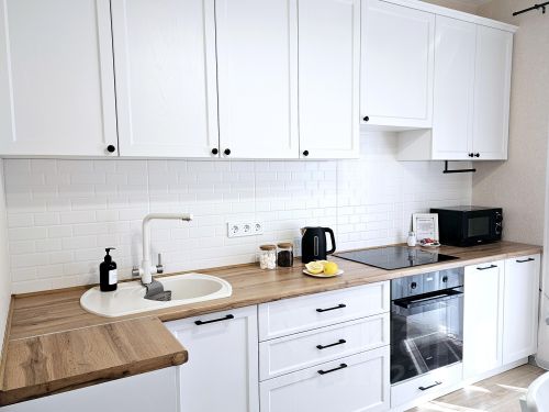 Полностью оборудованная кухня :варочная панель,духовка,вытяжка,посудомоечная машина,холодильник ,духовка ,чайник. Просторная ванная комната ,отдельный санузел с бойлером и умывальником.и еще один отдельный санузел -итого два раздельных санузла, что очень удобно !Вместительная прихожая купе.