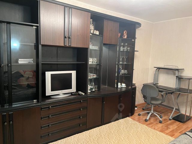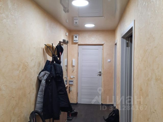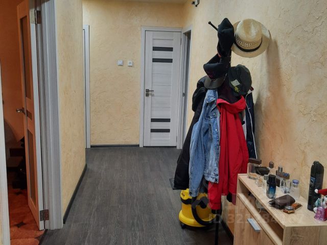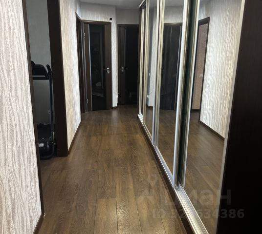 В зале во всю стену шкаф для хранения одежды, предметов и размещения бытовой техники (складные двери), в боковой секции шкафа еще одно рабочее место с персональным освещением и органайзерами, шкафчиками выдвигающееся как рэковый шкаф на колесиках. На стене климатическая установка бризер. Большой шкаф для хранения одежды и красивый раскладной диван.
